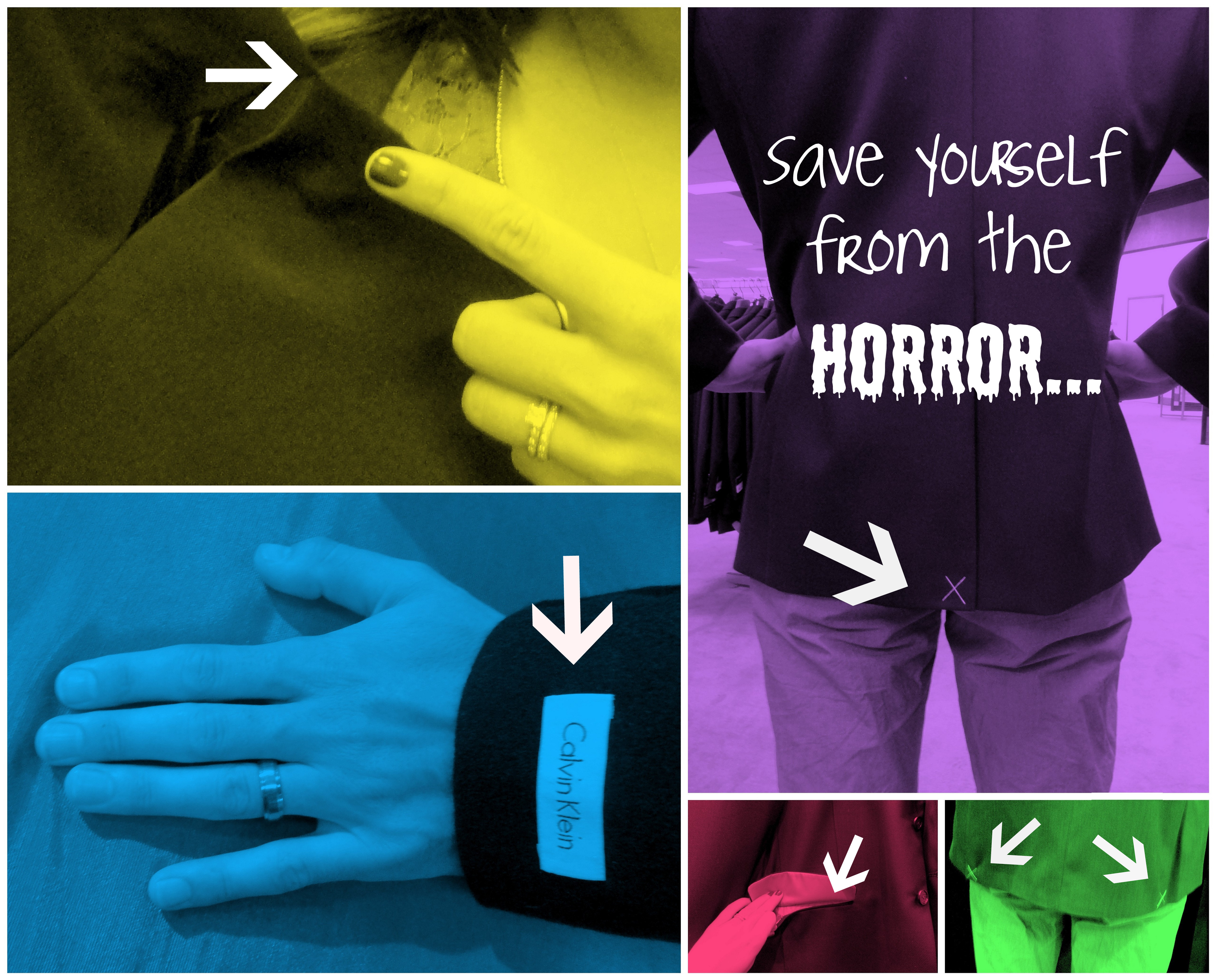 Even the fact that the thread is often a totally different color than the garment doesn’t seem to deter people. I can’t tell you how many times I’ve walked behind someone with a HUGE white “X” on their black jacket, or even the big, bright label still on the sleeve!