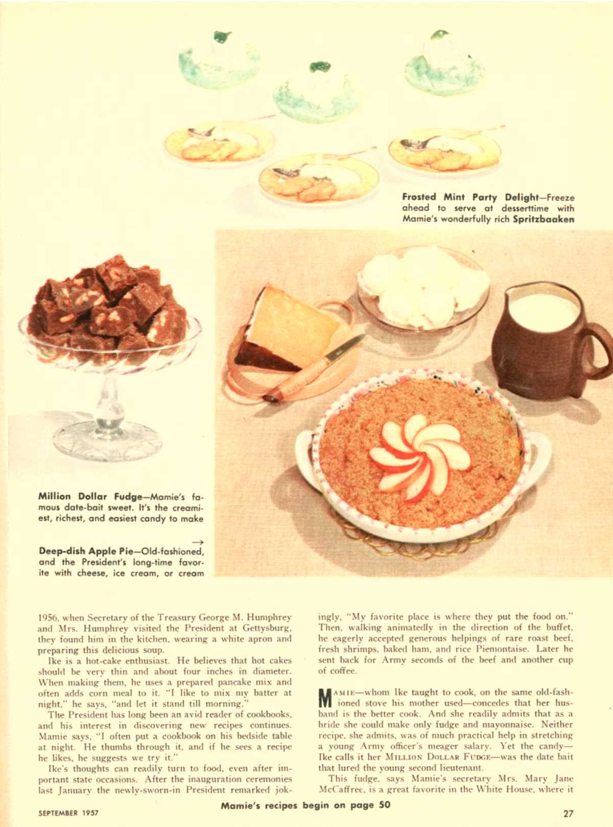 Apparently, the President’s wife, Mamie, didn’t start out being very fabulous in the kitchen. In fact, it was Eisenhower himself that was known for being a “Walking recipe book” and who was “as vain about his dishes as any fussy chef”. As a General, he paid special attention to the Army’s food-service, and it was said that he often used cooking to help him unwind during his time in office.