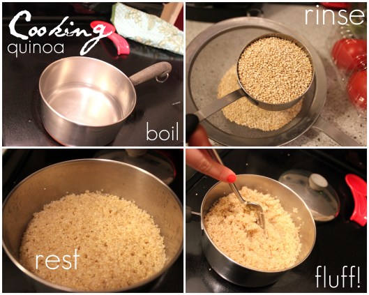 - 1 cup Quinoa, cooked per directions on package (white or red, you can also substitute other grains – farro is fun – just gotta love quinoa’s protein-punch!)
