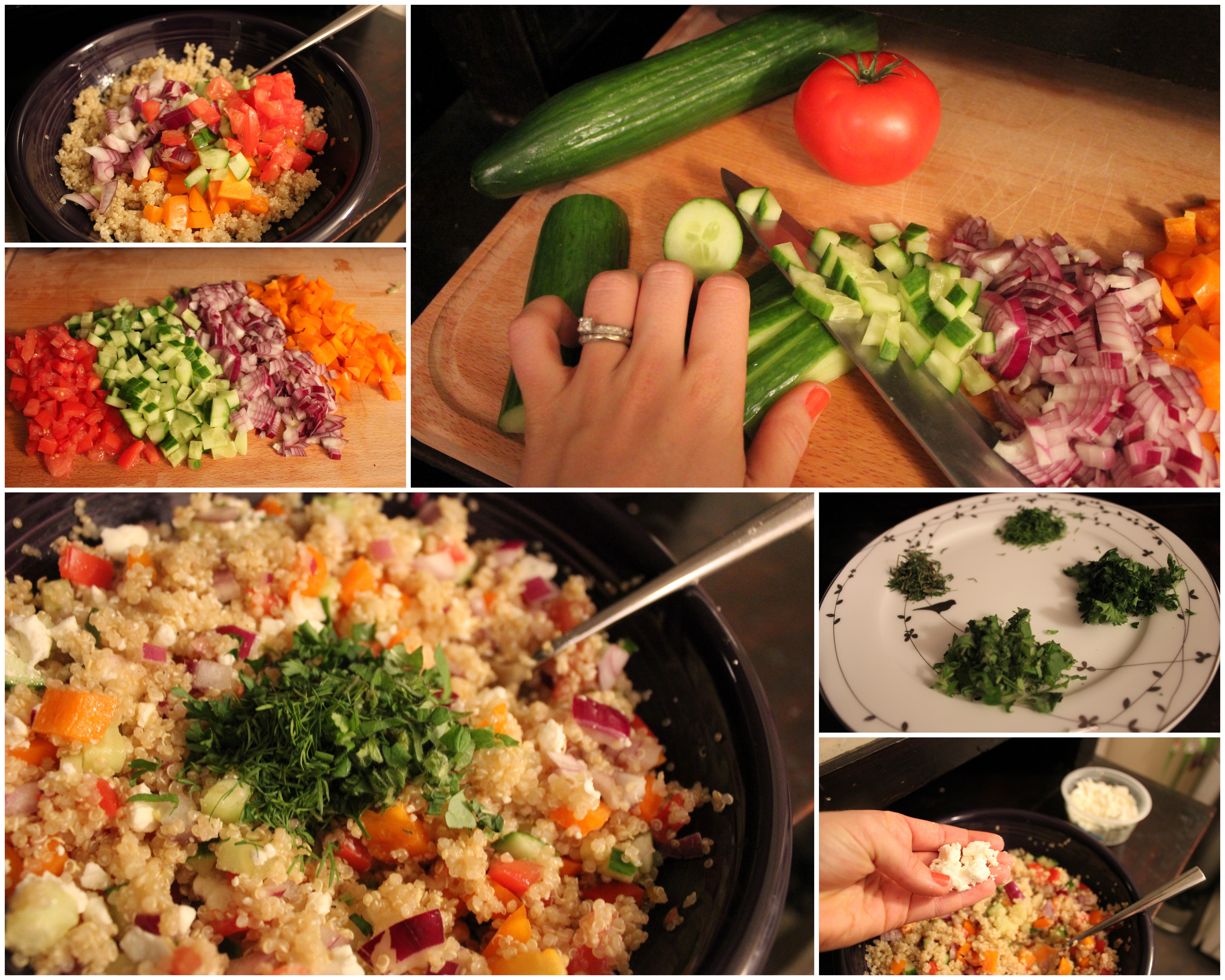- Chop vegetables, crumble cheese, add to quinoa – gotta love that color!