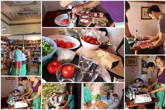 {Groceries were purchased, and the most amazing lunch on the planet was created: Pecorino Romano, ripe tomatoes, Pizza Bianco, Salami, strawberries, fresh mozzarella, and garden greens… bliss!}