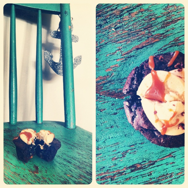 - Use a pastry bag, or a baggie with the tip cut off, to pipe a little of the frosting in a swirl on top of each cooled brownie. Top with a hint of a drizzle of the reserved caramel, chocolate shavings, and another little dash of sea salt.