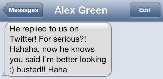 And, I almost died. I forgot the cardinal rule of twitter….. anyone can find anything. And, the gig was up. I had insulted a Food Network star. Actually THE Food Network Star. Publicly. I frantically texted Alex to commiserate, but he wasn’t much help: